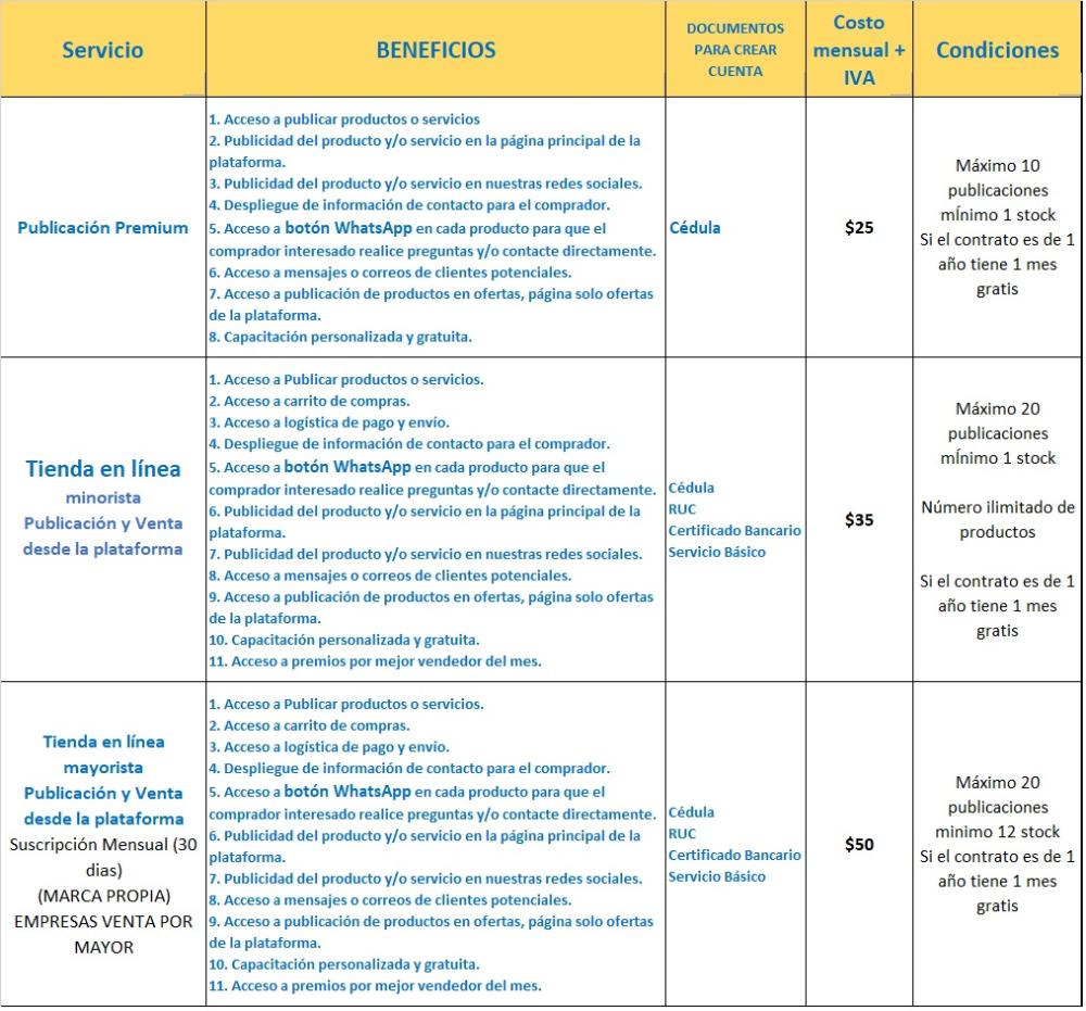 Los vendedores para publicación premium y tiendas en línea minoristas y mayoristas pagarán una tarifa mensual, según el cuadro de tarifas. El pago se realizará a través de tarjetas de crédito o débito en la plataforma, transferencia o depósito a las cuentas de la administradora de la plataforma.